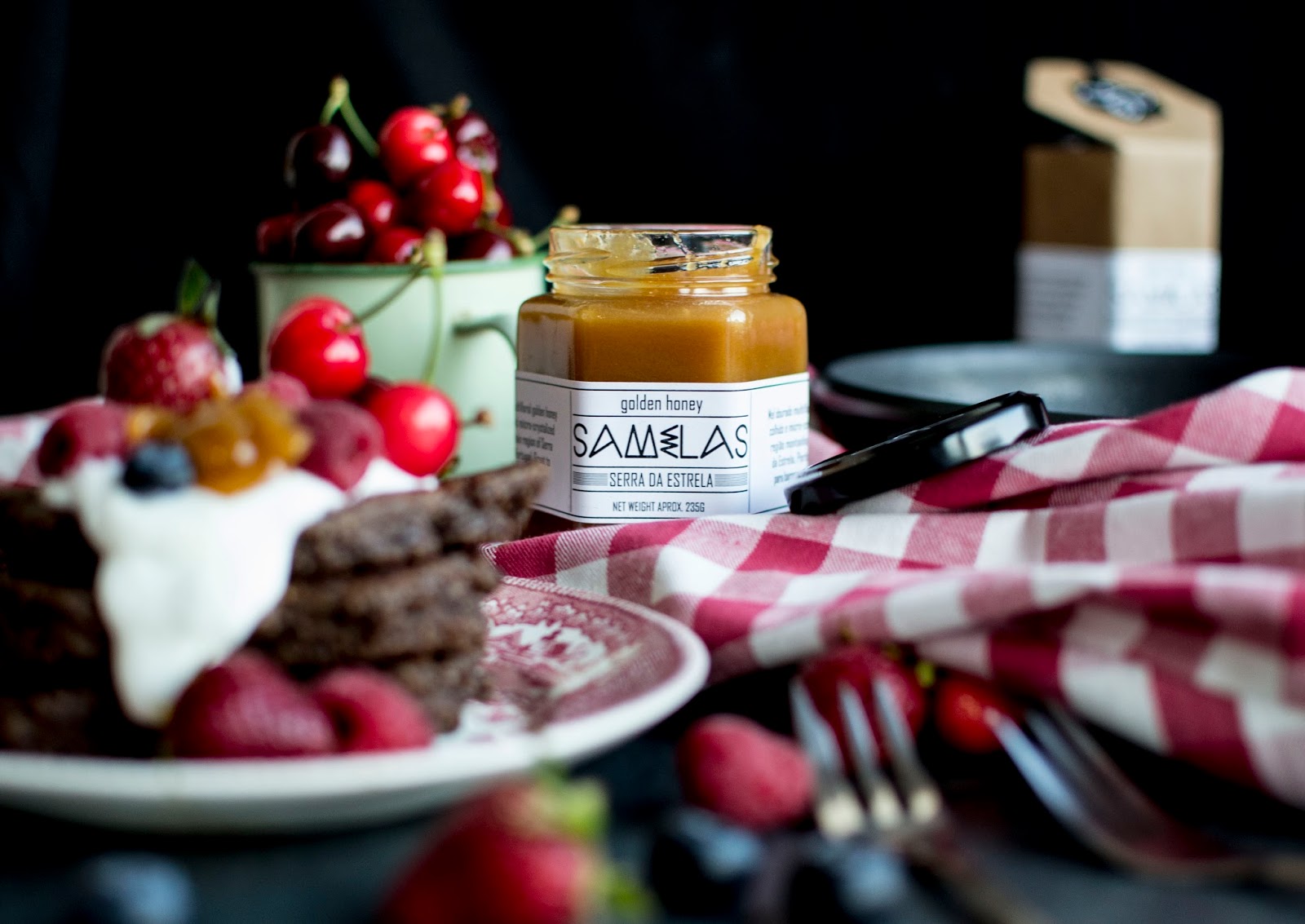 Uma receita de panquecas com alfarroba, cerejas e o nosso mel dourado pelo chef Rui Ribeiro do blog Faz & Come.